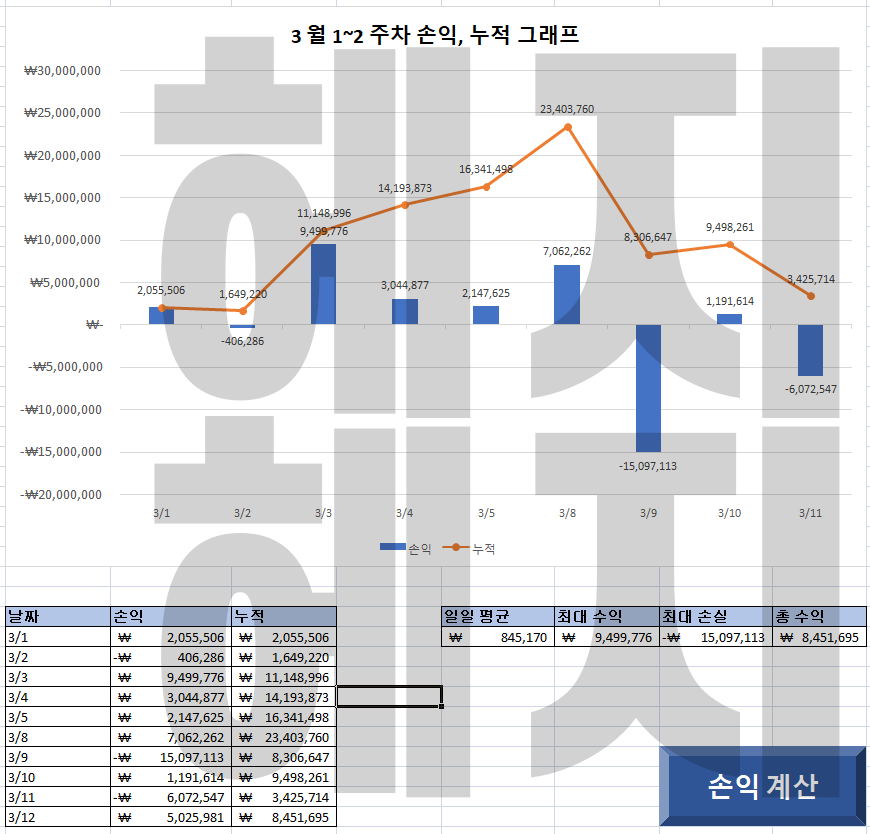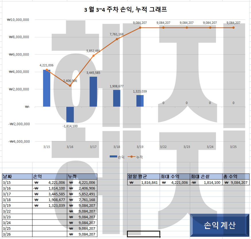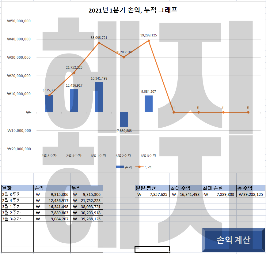 공식매매와 추가 매매를 모두 따라했을때 최대의 손실이 기록될 수 있습니다. 실지로는 추가매매는 신규회원이 적극적으로 대응하여 초반 누적을 선점한 경우도 있지만 대체로 기본 매매만으로 어느정도 누적수익을 충분히 달성한 분에 한하여 추가매매 부분을 진행하도록 하고 있습니다.