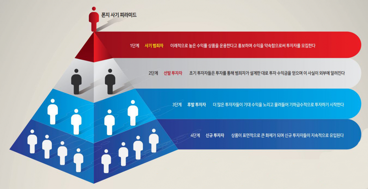 실제로는 이윤을 거의 창출하지 않으면서도 단지 수익을 기대하는 신규 투자자를 모은 뒤, 그들의 투자금으로 기존 투자자에게 배당(수익금)을 지급하는 방식으로 자행되는 다단계 금융 사기 수법
