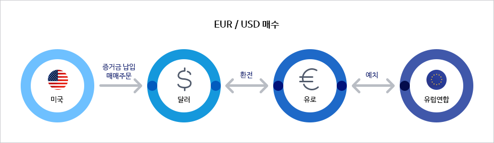 EUR/USD 1.34874에 매수하였다고 하면 앞에 있는 통화 EUR을 매수하고 뒤에 있는 통화 USD를 매도 한 것을 의미. 향후 EUR가 강세를 보일 것으로 예상이 되면 EUR을 매수하고, 반대로 USD 대비 EUR가 약세를 보일 것으로 예상되면 EUR를 매도 하여 차후 환차익을 실현한다.