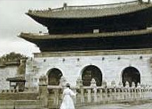 1890년대의 광화문 전경 : 고종 때인 1865년 흥선대원군 주도로 경복궁과 함께 중건된 것으로, 일제에 의해 훼손당하기 전 모습니다. 문 앞쪽으로 월대(돌계단)와 좌우의 돌 난간이 뚜렷하게 보인다.