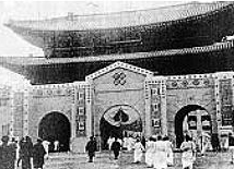 1923년 일제가 경복궁에서 개최한 조선부업품공진회 때 입구로 사용된 광화문 : 좌우 석축 부분에 일본식 장식문양이 붙어 있고, 가운데 입구에는 일장기가 드리워져 있어 광화문의 수난을 잘 보여준다.