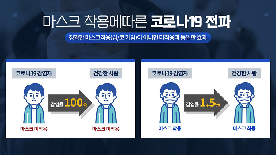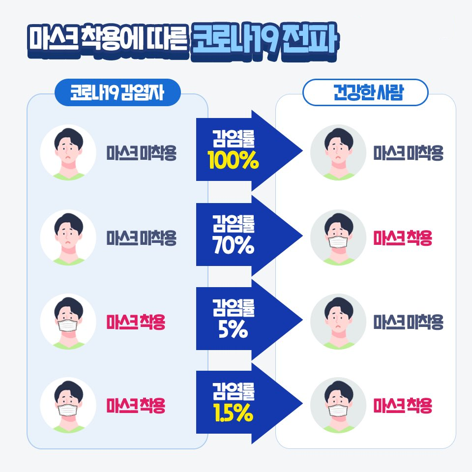 감염자가 마스크를 착용하지 않은 경우 비감염자가 아무리 마스크를 착용하더라도 70%의 확률로 전파된다는 사실!