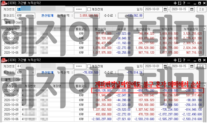 2. 시작일 2020.10.05~10.13 / 14일은 계좌 변경으로 매매휴가 옳지만 개별 진입으로 손실