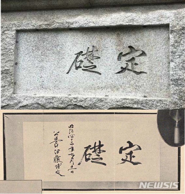 ↓[서울=뉴시스]사적 제280호 '서울 한국은행 본관' 현재의 정초석(위)과 일본 하마마츠시 시립중앙도서관의 이토 히로부미 붓글씨(사진=문화재청 제공)2020.10.21 ⓒnewsis
