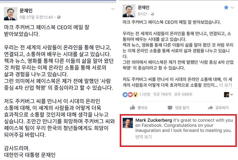 2017.05.21. 청와대는 마크 저커버그 CEO가 문재인 대통령의 취임을 축하한다고 이메일을 보내왔다고 말했다. 또한 사람 중심 4차 산업 추진에 적극 공감하며 조속한 시일 내에 만나기를 희망한다고 말하였다고 한다.