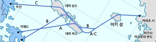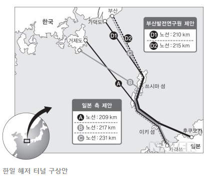 한반도에서 일본 쓰시마 섬과 이키 섬을 중간 경유지로 일본 규슈 지방까지 해저터널로 연결하려는 계획.