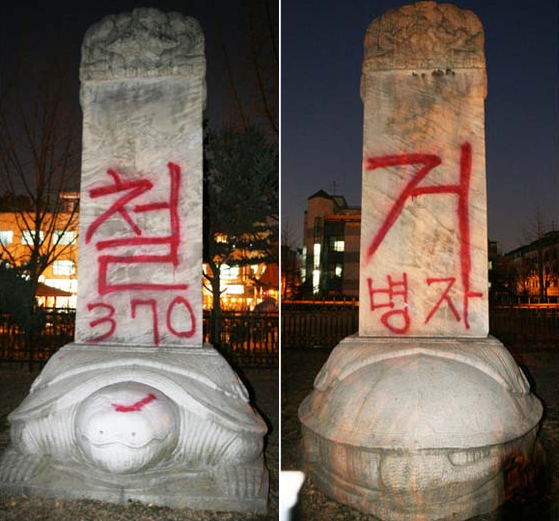 ↓병자호란 항복 기록한 "삼전도비" 훼손 ⓒ한겨레