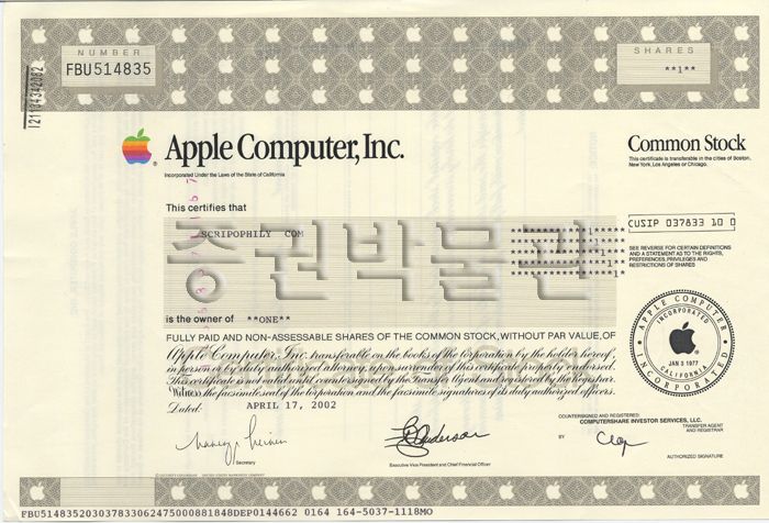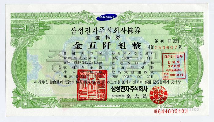 ↓이 종이는 2020년 1월 17일 기준으로 한장에 3,065,000원이다. 위 사진의 주식은 삼성전자의 실물 주식이며 액면가가 5000원이었을 때 발행된 것이다. 2018년 5월 4일부로 액면가가 100원(기존 액면가의 50 대 1 비율)으로 액면분할 되었으며, 사진속 주식은 현행 액면가 100원짜리 삼성전자 주식 50장과 같은 가치를 지닌다.