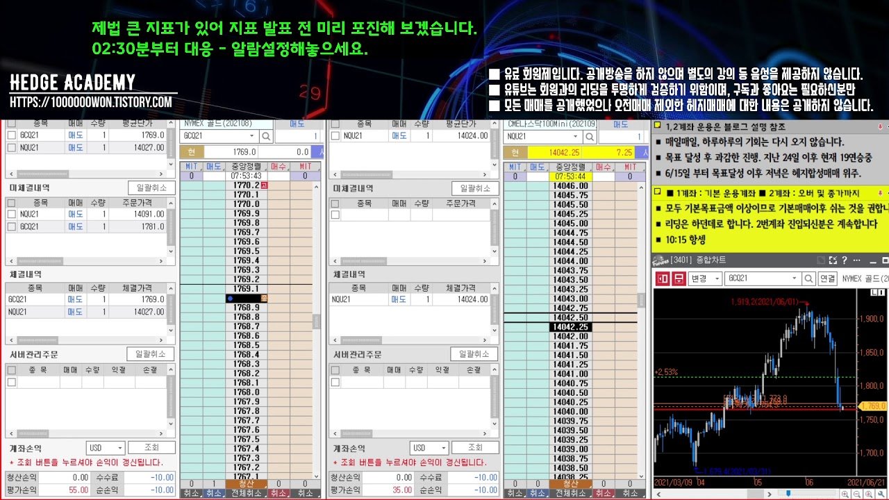 2021.06.21.월요일. 1,500,000 이상 달성 [해외선물/파생/헤지아카데미] : 일부 회원 요청으로 저녁 22시 부터 추가방송합니다