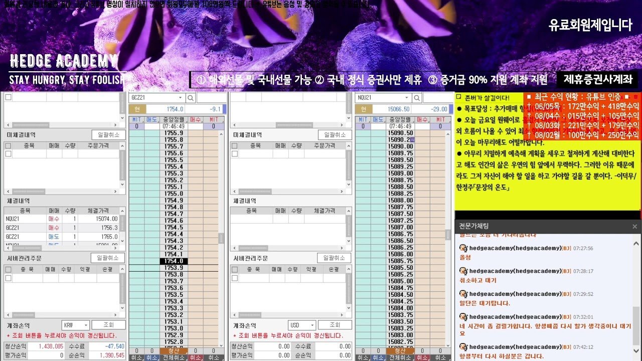 2021.08.09.월요일. 30분만에 목표달성. 최종 1,810,000 + 2,714,000(2계좌는손실종료)[해외선물/파생/헤지아카데미]